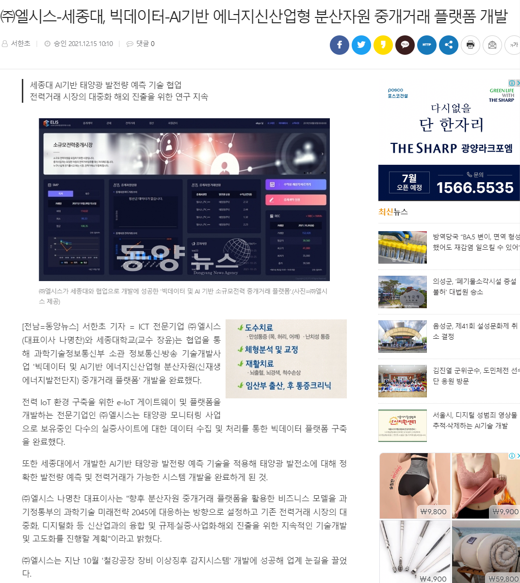 [동양뉴스] ㈜엘시스-세종대, 빅데이터-AI기반 에너지신산업형 분산자원 중개거래 플랫폼 개발